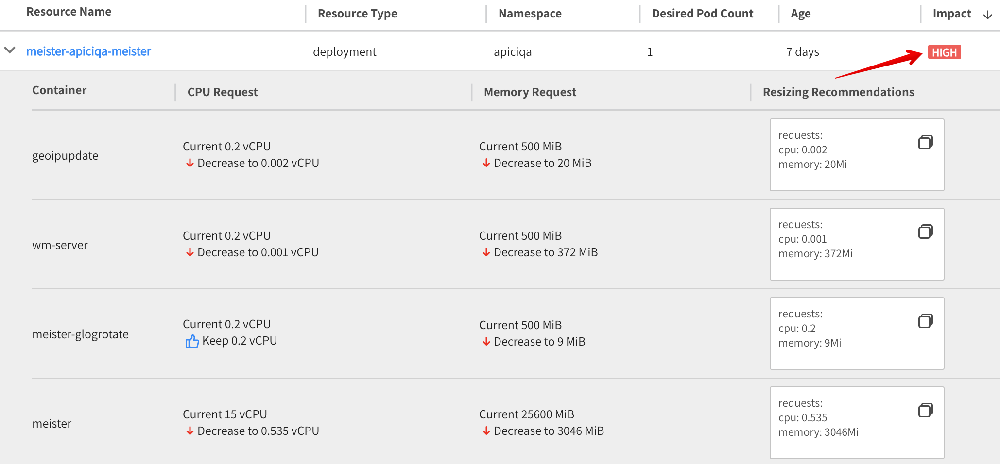For a given resource, you can see the specific recommendations per container by clicking on its Impact (e.g., High).