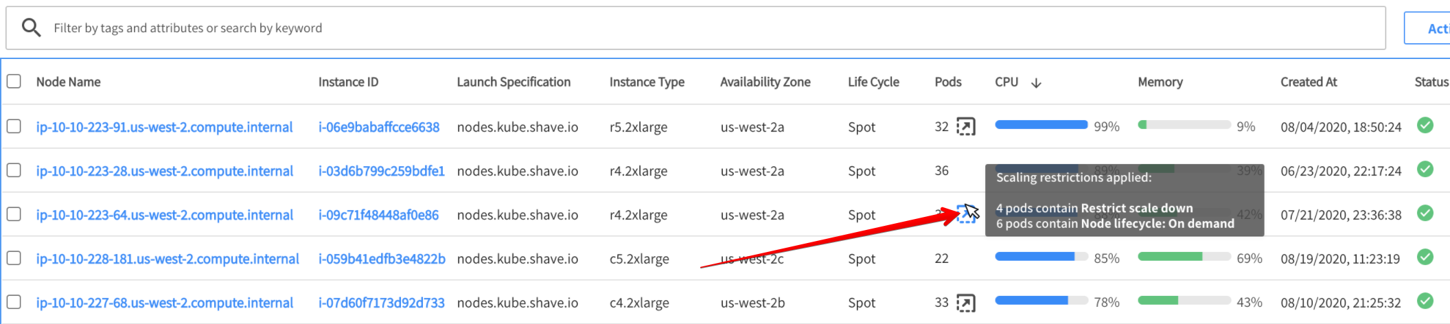 In addition to the overall summary in the summary line, the table provides summary information per node. In the Pods column, an arrow indicates that one or more pods in that node have scaling constraints. Click on the arrow to see a popup constraint summary for that node.